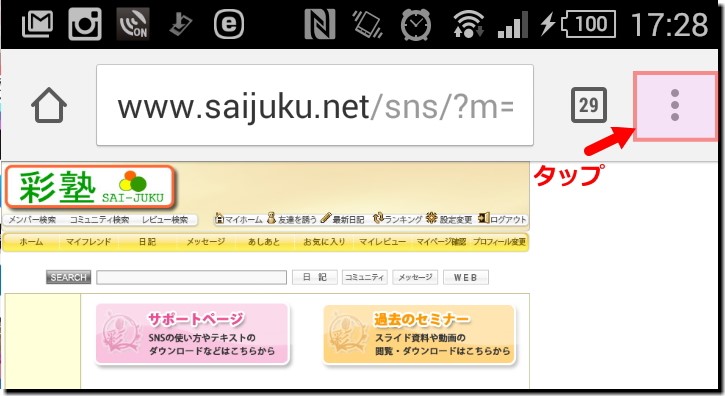 ブラウザのアプリ(グーグル「Chrome」でもサファリでもOK)で彩塾SNSを開きます。